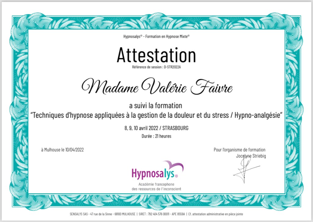 Agréée ASCA, membre APH Formatrice en hypnose, école HYPNOSALYS