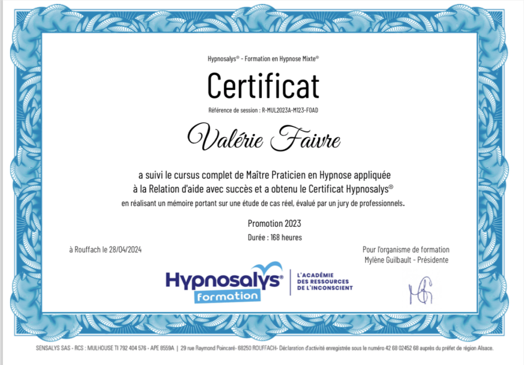 Formatrice en hypnose au sein de l’école Hypnosalys, notamment en hypnose transpersonnelle, je propose un accompagnement sérieux, respectueux du rythme de chacun et centré sur la qualité plutôt que sur la quantité.